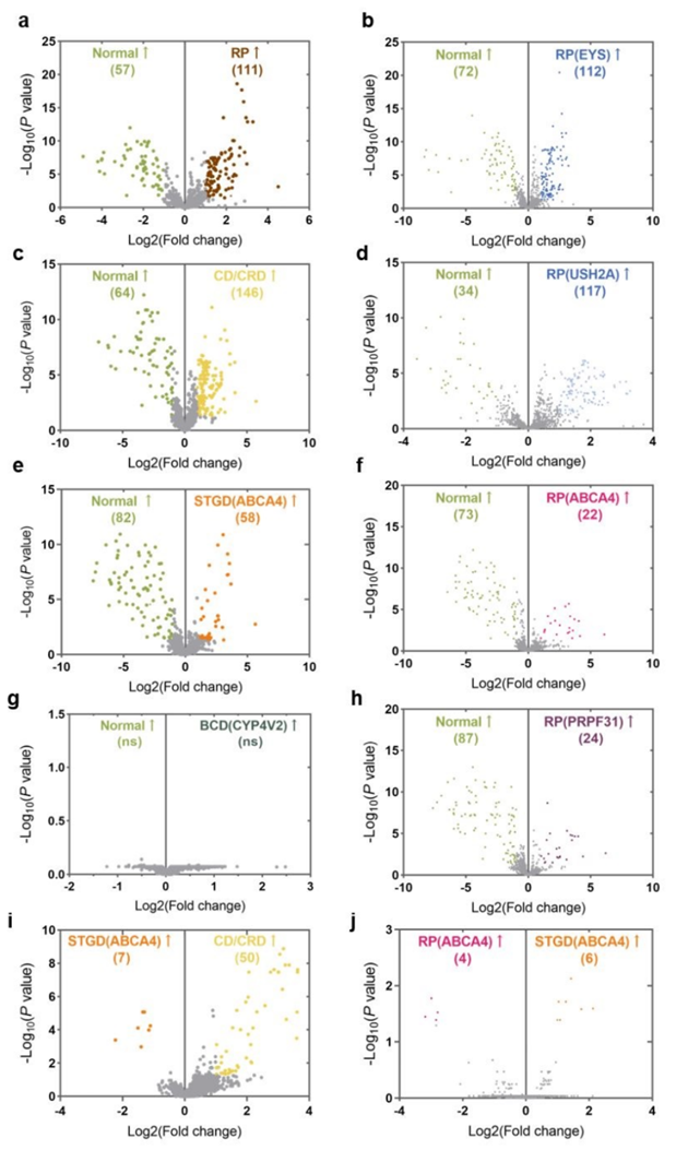 每个IRD亚组与对照组(a-h)、STGD与CDCRD (i)、RP与ABCA4基因型与STGD (j)之间比较的火山图。