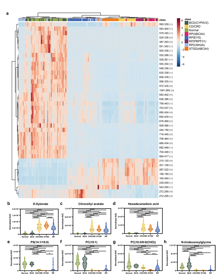 在评估的代谢物中,研究者团队使用方差分析选择了各组之间差异最显著的 40 种代谢物。不同IRD亚型的患者有不同的特征和模式。例如,与对照组相比,除 BCD 外,所有 IRD 亚型中都观察到 D-木糖酸酯、乙酸香茅酯和十六烷二酸水平升高(图2b-d)。相比之下,N-十一酰甘氨酸和其他三种甘油磷脂、磷脂酰丝氨酸 (14:1/16:0)、磷脂酰胆碱 [16:0/9:0(CHO)] 和磷脂酰胆碱 (19:1) 的浓度降低除 BCD 外的所有 IRD 亚型与对照组相比(图2e-h)。因此,对照组和BCD组之间存在很大的相似性,而IRD的其他亚型与对照组相比表现出不同的代谢模式。