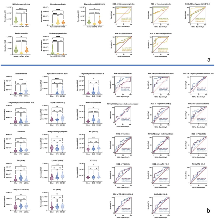 (a) 利用机器学习模型筛选出5个鉴定出的代谢物的小提琴图和ROC曲线用于诊断STGD和CD/CRD。(b) 使用机器学习模型选择14个鉴定出的代谢物的小提琴图和ROC曲线诊断EYS和USH2A相关RP。