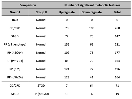 表1. 每次比较中显著特征的数量,用于量化每个IRD亚型和健康对照之间的代谢差异