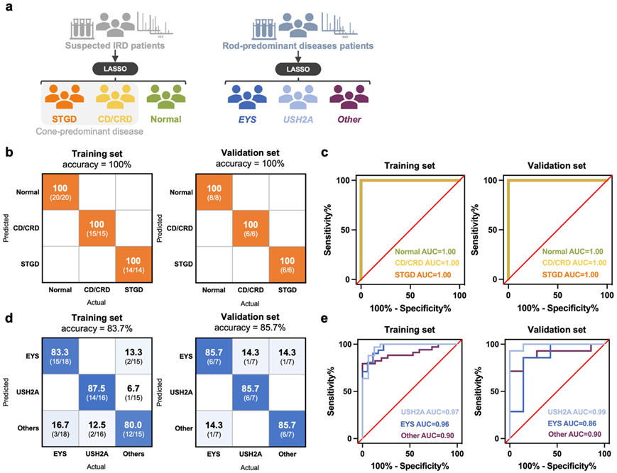 (a) 使用机器学习 LASSO 模型建立了两种诊断模型来区分 (1) CD/CRD、STGD 和对照组和 (2) 具有EYS、USH2A和其他基因型的 RP。(b) 锥体显性疾病诊断模型训练集和验证集的敏感性和特异性均为100%。(c) 三个亚组的曲线下面积(AUC)均为1.0 。(d) RP诊断模型的训练集诊断准确率为83.7%,验证集诊断准确率为85.7%。(e) 在训练和验证集中,USH2A、EYS和其他基因型的RP诊断模型的AUC。