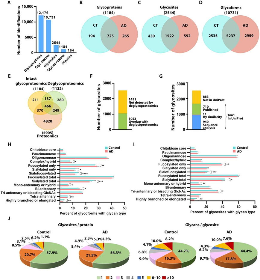 (A) 本研究中确定的独特 N-糖肽、N-糖型、N-糖蛋白、N-糖位点和 N-聚糖成分的总数。(B-D) AD 与对照 (CT) 大脑中已识别的 N-糖蛋白、N-糖位点和 N-糖型的比较。(E) 完整糖蛋白组学鉴定的 N-糖蛋白与蛋白质组学和去糖蛋白组学检测的蛋白质的比较。(F) 已识别的 N-糖位点与去糖蛋白组学检测到的重叠。(G) 已识别的 N-糖基化位点与带注释的 N-糖基化位点的 UniProt 数据库的匹配。 (H-I) AD 和对照大脑中含有指定聚糖类型的已识别 N-糖型和 N-糖位点的分布。(J) 饼图显示 AD 和对照大脑中每个蛋白质具有指定数量的体内 N-糖位点(宏观异质性)的糖蛋白的比例以及每个位点具有指定数量的 N-糖基团(微观异质性)的糖蛋白的比例。
