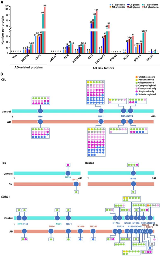 (A) 条形图显示了与 AD 和对照 (CT) 大脑中每个 AD 相关蛋白和危险因素相对应的已识别 N-糖位点、N-聚糖组成和 N-糖型的数量。(B) 与对照大脑相比,AD 中 CLU、tau、TM2D3 和 SORL1 的位点特异性糖基化模式。