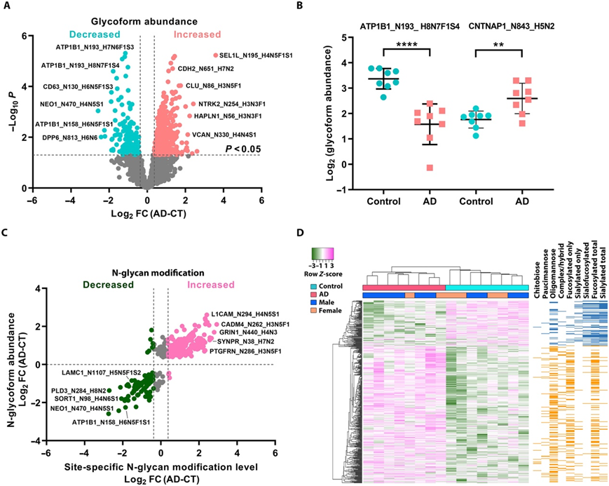 (A) AD 中单个糖型丰度的差异倍数。(B) AD 中丰度减少或增加的已识别糖型的示例。(C) 散点图显示大多数已识别的 AD 相关糖型的位点特异性聚糖修饰。(D) 基于已识别的 449 个具有改变的位点特异性聚糖修饰的糖型,对个体临床病例进行无监督的层次聚类。