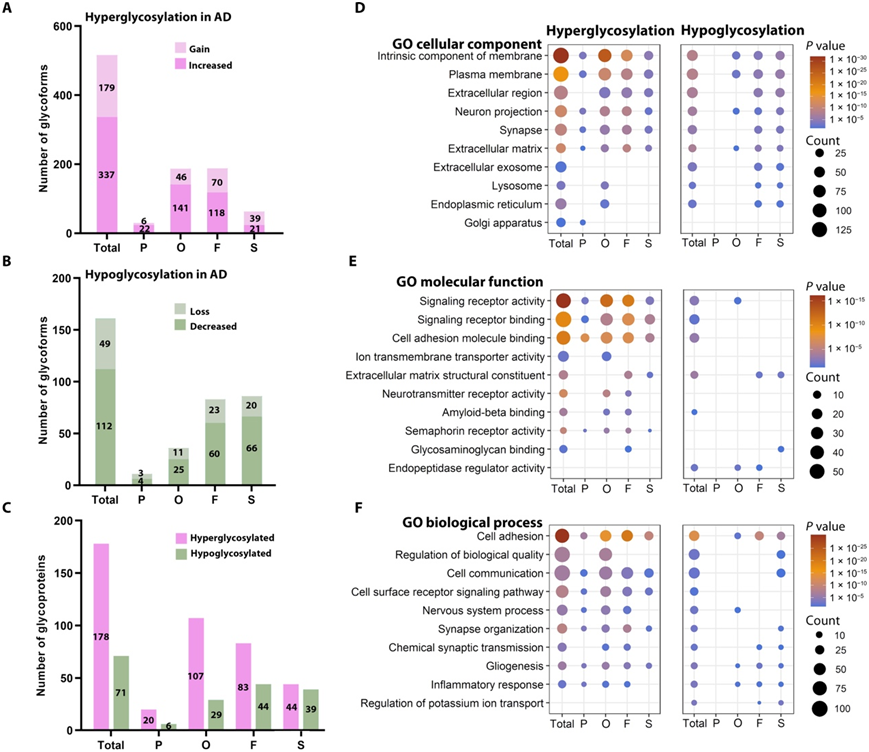 (A-C) 高糖基化包括糖型和糖蛋白,在 AD 中具有增加的位点特异性 N-聚糖修饰和/或增加位点特异性 N-聚糖修饰,而低糖基化包括糖型和糖蛋白AD 中位点特异性 N-聚糖修饰减少和/或位点特异性 N-聚糖修饰完全丧失。(D-F)GO分析。