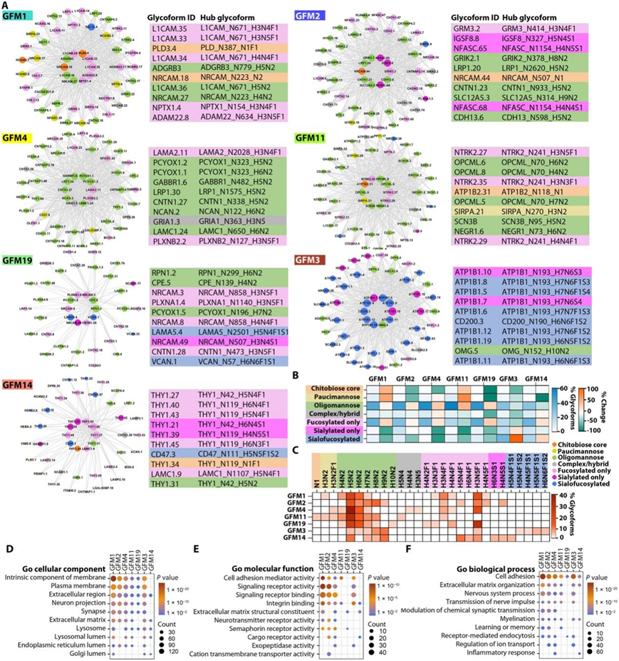 为了阐明 AD 中具有不同位点特异性聚糖修饰的蛋白质糖型之间的关系,他们使用 WGCNA 进行了糖型共调节网络分析,以构建一个糖型网络,其中的节点表示与基于糖型丰度谱的成对相关模式的连接定义的边缘连接的糖型(图7A)。网络分析揭示了人脑糖蛋白组组织成由 21 个共调节糖型模块组成的网络(图7A-B)。这些糖型模块(GFM)标记为GFM1(最大的模块包含159个糖蛋白中的440个糖蛋白)到GFM21(最小的模块包含16个糖蛋白中的36个糖蛋白)(图7B)。在糖型网络中,单个蛋白的不同糖型往往存在于不同模块中,如GABA-B受体亚单位GABBR1糖型对GFM2(GABBR1_N440_H5N2和GABBR1_N440_H3N5F1糖型)、GFM4(GABBR1_N482_H5N2糖型)、GFM8 (GABBR1_N440_H4N4F1糖型)、GFM14 (GABBR1_N502_H4N5S1糖型)和GFM21 (GABBR1_N440_H5N4F1糖型)模块的差异分布。一些糖型在同一模块中的共定位(例如GFM2 模块中存在两个 GABBR1 糖型)表明这些糖型及其位点特异性聚糖修饰的协调调节,而糖型划分为单独的模块(例如分布GFM2、GFM4、GFM8、GFM14 和 GFM21 模块中 GABBR1 糖型的差异)可能反映了位点特异性聚糖修饰的差异调节或不同糖型的不同细胞或亚细胞分布。