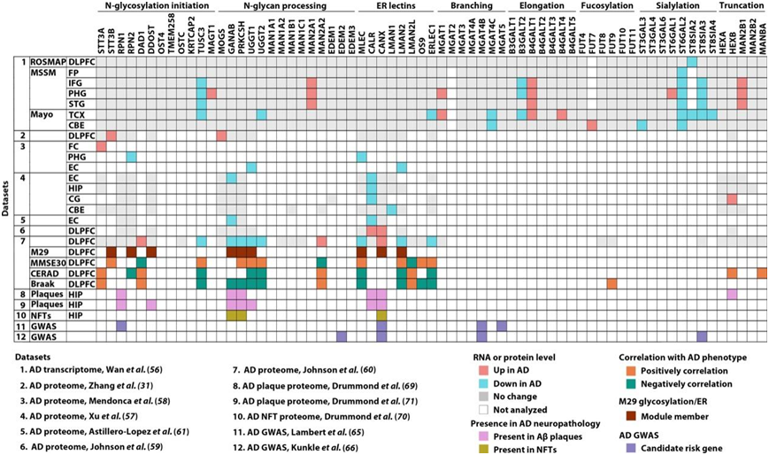 图2. AD 相关蛋白和危险因素的位点特异性聚糖和糖型图谱。