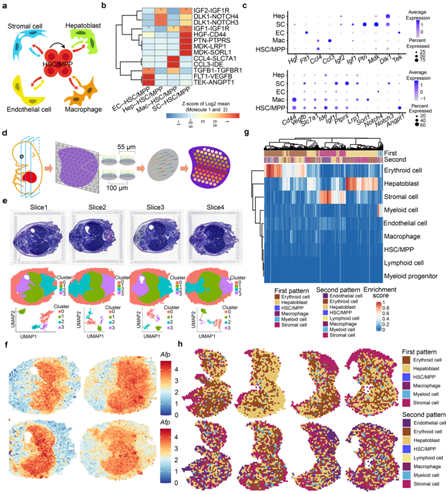 (a) HSC/MPP 与微环境细胞(内皮细胞、基质细胞、成肝细胞和巨噬细胞)之间的细胞间相互作用。 (b) CellPhoneDB 分析显示主要的 HSC/MPP-生态位细胞相互作用对。 (c) 主要HSC/MPP-生态位细胞相互作用对的配体(顶部)和相应受体(底部)表达模式的点图。 (d) 10×Visium ST 实验流程示意图。 (e) ST 分析中包含的胚胎天数 (E)14.5 胚胎组织切片(上)的苏木精和伊红 (HE) 染色。(f) 组织切片中肝母细胞标记物Afp的表达模式。(g) FL 截面中两个点图的空间特征图。