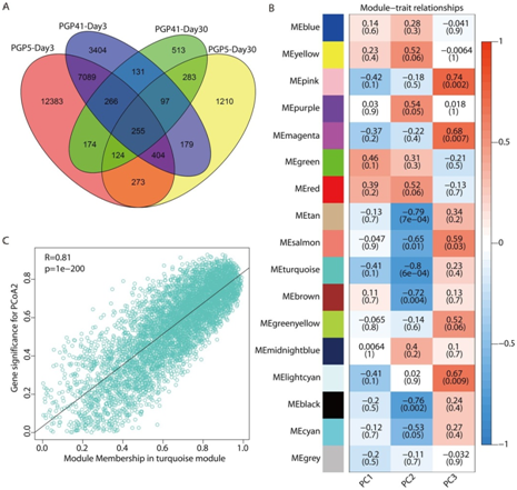 加权基因共表达网络分析(WGCNA)用于确定具有高度相关表达模式的DEGs的模块以及根系基因表达与根际微生物组的关联。共鉴定出16个共表达模块(图 4B)。该团队进一步考察了图 1G中微生物群落PCoA的3个主要主成分所代表的根际微生物组的模块特征基因与性状之间的关系。8个模块(P < 0.05)与PCoA2或PCoA3显著关联,另外5个模块(P < 0.06)仅与3个模块弱关联,与3个主成分不相关(图 4B)。结果表明,根中DEGs的表达与根际微生物组高度相关,特别是绿松石模块(图 4C, R=0.81, P < 0.001)。结合大部分差异表达基因及其在后期显著富集的功能在前期也被检测到的结果,这些结果表明微生物组诱导的根系基因表达变化选择性地维持到后期。