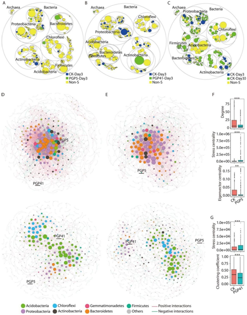 尽管根系的生长和发育是影响根际微生物组的主要因素,但接种诱导的根际微生物组的变化在早期就被检测到。与CK-Day 3相比,PGP5-Day 3和PGP41-Day 3共检测到58个丰度差异显著的属(图 2A, B)。这些结果表明,PGP41-Day 3或PGP5-Day 3的差异丰度属主要在早期发挥作用,在后期恢复到CK水平。此外,在共现网络分析中发现早期和晚期之间存在显著差异(图 2D-G)。此外,CK与PGP5或PGP41的网络在早期阶段存在显著差异,但在晚期阶段没有显著差异,这一点被节点级特征所证实(图 2F, G)。此外,接种PGP5或PGP41显著降低了前期的负相关性,由19.7% (CK)降至13.6% (PGP5)和10.5% (PGP41) (图 2D, E)。后期负相关性差异不显著,CK、PGP5和PGP41分别为26.4%、28.6%和27.2%。后期与前期相比负相关性的增强可能是由于根系对特定细菌的募集,排除了非相关细菌。总的来说,上述结果表明,在分类学水平上,根系对根际细菌的招募作用具有持久性,而接种主要影响早期的根际微生物组。