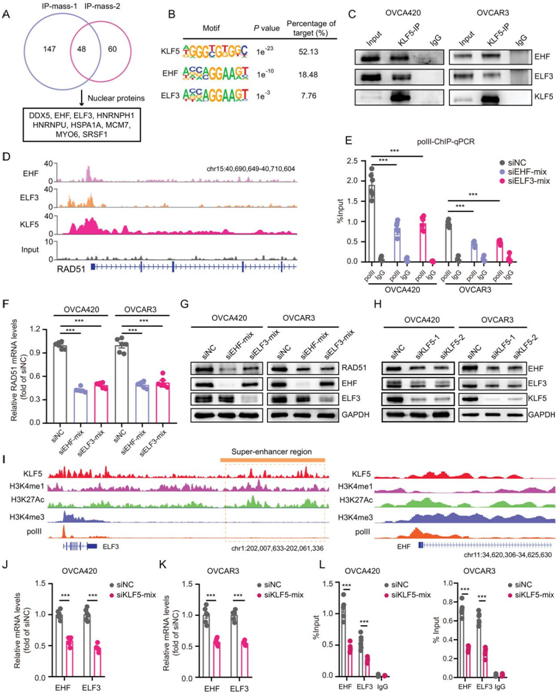 (A) 免疫沉淀-质谱法。(B) OVCA420 细胞中KLF5、EHF和ELF3的基序分析。 (C) 免疫共沉淀分析显示OVCA420 和 OVCAR3 细胞中内源性KLF5、EHF和ELF3之间的相互作用。(D) ChIP-seq 数据显示EHF、ELF3和KLF5在RAD51中富集OVCA420 细胞中的启动子区域。(E) 在转染EHF、ELF3 siRNA或对照siRNA的OVCA420和OVCAR3细胞中,polII在RAD51启动子区域的富集能力。 (F-G) 用EHF、ELF3 siRNA或对照siRNA转染的OVCA420和OVCAR3细胞中的RAD51 mRNA水平和蛋白质水平。 (H) 用KLF5 siRNA或对照siRNA转染的OVCA420和OVCAR3细胞中的EHF、ELF3和KLF5蛋白水平的免疫印迹。 (I) KLF5、H3K4me1、H3K27Ac、H3K4me3和polII的ChIP-seq数据显示,在OVCA420细胞中,KLF5富集于ELF3启动子区、SE区和EHF启动子区。(J-K) 用KLF5 siRNA 或对照 siRNA转染的 OVCA420 (J) 和 OVCAR3 (K) 细胞中的EHF和ELF3 mRNA 水平。 (L) 用KLF5 siRNA或对照siRNA转染的OVCA420细胞和OVCAR3细胞中RAD51启动子区域中EHF和ELF3的富集能力。