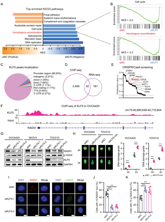 (A) 在用KLF5 siRNA 或对照 siRNA转染的 OVCA420 细胞中,前六个富集的 KEGG 下调通路和三个上调的通路。(B) GSEA富集了转染KLF5 siRNA或对照siRNA的OVCA420细胞的细胞周期和同源重组通路。(C) KLF5在OVCA420细胞中的全基因组结合位点,大部分位于启动子区域。(D) KLF5 ChIP-seq和RNA-seq数据的韦恩图显示了32个在OVCA420细胞中受KLF5转录调控的基因。 (E) Depmap 数据集中的 OVCA420 中的KLF5靶基因表明这些基因参与了 OC 细胞增殖。(F) OVCA420 中KLF5的 ChIP-seq 数据显示KLF5在RAD51启动子区域的结合。 (G) 用KLF5 siRNA或对照siRNA转染的OVCA420、SKOV3和TOV21G细胞中RAD51、p-H2AX、KLF5蛋白水平的免疫印迹。 (H) 用KLF5 siRNA 或对照 siRNA转染的 OVCA420 和 TOV21G 细胞中的彗星测定。(I)免疫荧光染色。(J-K) RAD51灶和γ-H2AX灶的定量结果。