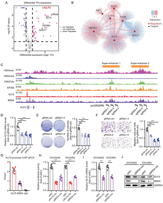 (A) 使用 FUSCC 队列 RNA-seq 数据,火山图显示 OC 中 TF 的差异表达,包括 8 个正常卵巢组织和 30 个 OC 组织。(B) TF 的差异表达及其下游基因的调控网络。(C) H3K4me1、H3K4me3、H3K27Ac、EP300、KLF5和BRD4在KLF5启动子和两个上游 SE 处的 ChIP-seq。 (D) 转染 dCas9-KRAB、靶向KLF5 SE 的 sgRNA 和 MCP-LSD1 慢病毒的 OVCA420 细胞中KLF5的 mRNA 水平。(E-F) 使用 enCRISPRi 慢病毒阻断KLF5 SE 可抑制 OVCA420 细胞中的集落数量形成和迁移能力 (G) ChIP-qPCR 测定显示OVCA420 细胞中KLF5和BRD4在KLF5启动子处的结合。 (H) OVCA420和OVCAR3细胞中用KLF5或BRD4 siRNA转染的KLF5启动子的荧光素酶活性。(I-J) BRD4 sirna转染的KLF5在OVCA420和OVCAR3细胞中的mRNA水平和蛋白水平。