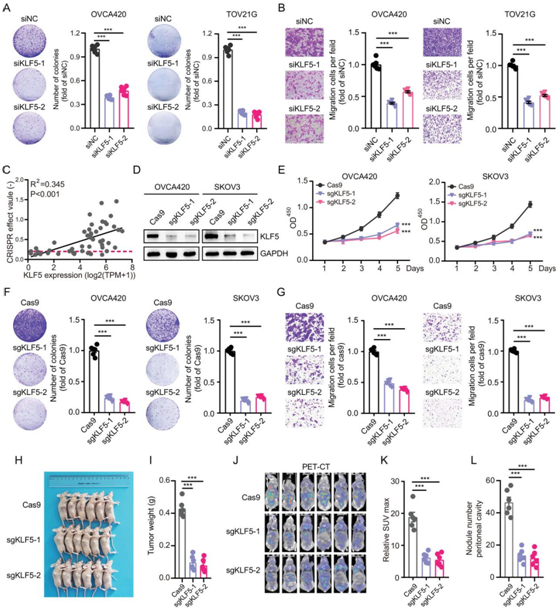 (A-B) 用KLF5 siRNA 或对照 siRNA转染的 OVCA420 和 TOV21G 细胞的克隆形成测定和迁移测定。 (C) Depmap 数据集中 OC 细胞系中KLF5 mRNA 水平与 CRISPR 影响值(增殖能力)之间的相关性。(D) 感染 Cas9 和KLF5 sgRNA 的 OVCA420 和 SKOV3 细胞中KLF5蛋白水平的免疫印迹。 (E) CCK8测定。 (F-G)克隆形成实验和迁移实验。(H) 裸鼠的异种移植瘤。 (I) KLF5的敲除减少了异种移植肿瘤的重量。(J) PET-CT显示感染Cas9和KLF5 sgRNA的TOV21G细胞的腹部肿瘤转移。(K-L) 感染Cas9和KLF5 sgRNA的TOV21G细胞腹膜腔的相对SUV最大值和结节数。