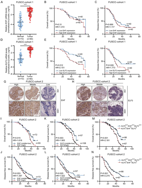 (A) FUSCC 队列 1 中正常样本和 OC 样本中的 EHF mRNA 水平。(B-C) FUSCC 队列 1 中总生存期和无病生存期的 Kaplan-Meier 曲线。(D) FUSCC 队列 1 中正常和 OC 样本中ELF3的 mRNA 水平。 (E-F) FUSCC 队列 1 中总生存和无病生存的 Kaplan-Meier 曲线。(G-H)免疫染色图像。 (I-N) Kaplan-Meier 曲线。