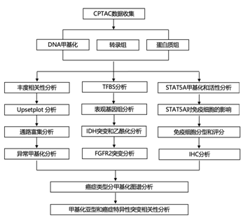 本项研究利用 687 个肿瘤的多组学分析,并匹配来自肾、脑、胰腺、肺、头颈和子宫内膜的未受累邻近组织,以鉴定与 RNA 和蛋白质丰度变化相关的异常甲基化,并建立一个泛癌图谱。他们发现了谱系特异性表观遗传驱动因素,包括子宫内膜癌中低甲基化的FGFR2 。高甲基化的STAT5A与普遍的调节子下调和免疫细胞耗竭相关,表明STAT5A表达的表观遗传调控构成了鳞状肿瘤中免疫抑制的分子开关。并进一步证明甲基化亚型富集信息可以解释细胞起源、肿瘤内异质性和肿瘤表型。总体而言,这些结果确定了驱动转录和翻译变化的顺式作用 DNA 甲基化事件,揭示了肿瘤的表观遗传景观及其起源细胞的作用。