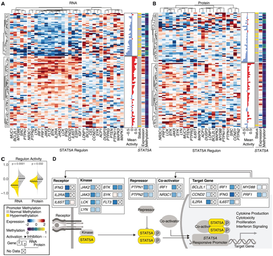 TF 表达的改变会破坏其调节子的活性,调节子是一组受共同调节元件调节的基因。为了估计异常 DNA 甲基化对调节子活性的影响,他们首先在 TF 上鉴定了 14 个顺式作用高甲基化事件,然后测试它们与相应调节子的关联,例如参与同一途径的受体、激活子、阻遏子和靶基因。他们发现,在 RNA 表达和蛋白质丰度水平上,高甲基化 TF 与低调节子活性之间存在显著关联。由于 STAT5A 调节子包含最多数量的相互作用基因,因此他们重点关注 STAT5A 进行下游分析。