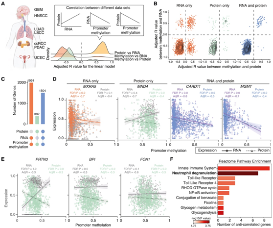 (A) 左:为本研究收集的肿瘤类型示意图。右:密度图显示蛋白质丰度与RNA表达(黄色)、启动子甲基化与RNA表达(橙色)或蛋白质丰度之间调整后R值的分布。(B)散点图显示启动子甲基化与RNA(左,橙色)、蛋白质(中,绿色)或RNA和蛋白质(右,蓝色)相关的基因调整后的R值分布。(C) Upsetplot 显示基于基因与启动子甲基化和 RNA/蛋白质表达的相关性。(D) 启动子甲基化、RNA 表达和蛋白质丰度之间具有明显相关性的示例。(E)具有启动子高甲基化的反相关基因的例子,表现出RNA水平的上调和蛋白质水平的下调。(F) 31个启动子高甲基化反相关基因的通路富集分析,显示RNA水平上调和蛋白质水平下调。