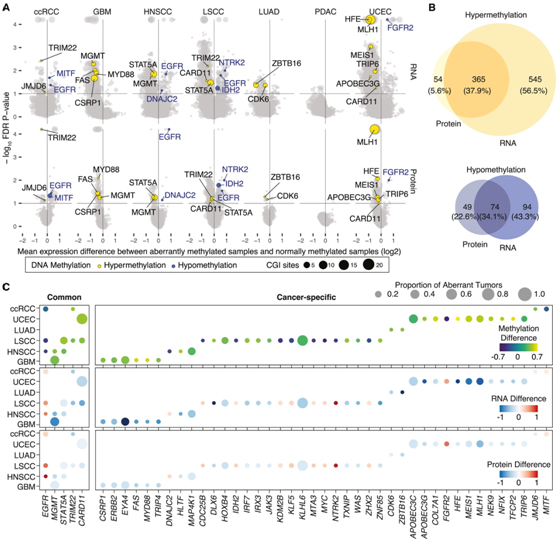 (A) 异常样本和正常样本之间基因的 RNA 表达(上)和蛋白质丰度(下)变化。(B) 维恩图显示具有显著 RNA 表达和/或蛋白质丰度变化的高甲基化(上)和低甲基化(下)基因的数量。(C) 癌症相关基因的常见和癌症类型特异性异常甲基化。