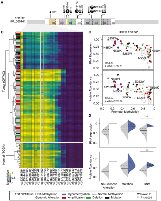 包括FGFR2和EGFR在内的几种受体酪氨酸激酶 (RTK)分别在 UCEC 和各种癌症类型中经常出现低甲基化(图 2C)。为了分析低甲基化RTK对癌基因激活的作用,他们检测了启动子甲基化与遗传改变之间的关系,确定了突变、融合和拷贝数变异(CNV) 及其对 RTK RNA 和蛋白质水平的影响。