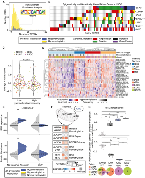(A) 功能性高甲基化(黄色)和低甲基化(蓝色)的转录因子结合位点数量的分布。(B) LSCC 中驱动基因的基因组和表观基因组改变的相互排斥和共现。(C) 小提琴图,比较高度高甲基化肿瘤和低度高甲基化肿瘤之间的组蛋白H3 乙酰化水平。(D) 组蛋白位点热图显示免疫亚型之间显著差异乙酰化。(E) 根据IDH2基因组改变和IDH2低甲基化(蓝色)与IDH2正常甲基化(灰色)分层的 RNA 表达(上)和蛋白质丰度(下)水平。(F) 路径图显示 LSCC 中IDH2低甲基化样品和正常甲基化样品之间 RNA 表达(左方块)和蛋白质丰度(右方块)的平均差异。(G) IDH1/IDH2野生型、IDH1 突变体、IDH2低甲基化样品和IDH2突变体样品中组蛋白乙酰化水平和 α-KG 靶基因甲基化水平的正相关系数(上)和负相关系数(下)。