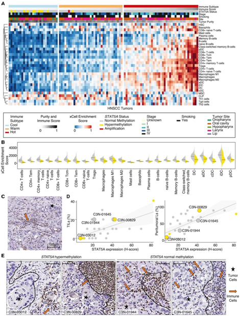 接下来,为了进一步确定STAT5A高甲基化在 HNSCC 中的表达特异性,他们通过免疫组织化学(IHC) 标记 STAT5A 评估了 29 个代表性 HNSCC 病例。他们发现 STAT5A蛋白在肿瘤浸润淋巴细胞 (TIL) 和瘤周淋巴细胞中显著表达,而 STAT5A 在肿瘤细胞中表达最少或不表达(图 6 C)。STAT5A 丰度的总体水平与 TIL 或瘤周淋巴细胞的水平相关(图 6D)。有趣的是,具有高甲基化STAT5A 的样本显示肿瘤细胞和表达 STAT5A 的免疫细胞之间存在明显的界限(图 6 E),而具有正常甲基化STAT5A的肿瘤样品显示肿瘤细胞和表达 STAT5A 的免疫细胞的混合物(图 6 E)。