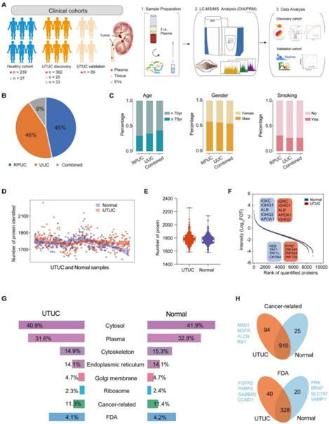 (A) 蛋白质组学工作流程涉及三个模块:队列构建(发现队列和验证队列)、蛋白质组分析和数据分析。(B) 饼图显示 UTUC 发现队列的组成比例。(C) UTUC 发现队列的临床数据。(D) 在 UTUC 和 UTUC 发现队列的正常血浆样本中鉴定的蛋白质。(E) 在 UTUC 和 UTUC 发现队列的正常血浆样本中鉴定的蛋白质数量。(F) 根据 UTUC 和 UTUC 发现队列的正常血浆样品中蛋白质丰度的降序排列,每个样品的蛋白质鉴定的动态范围。(G) 血浆蛋白质组中鉴定的成分。(H) UTUC 发现队列中发现的癌症相关蛋白和与 FDA 批准的药物相关的蛋白。