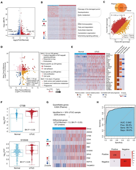 (A) UTUC 和正常血浆样本之间的蛋白质丰度差异。(B) UTUC 和正常血浆样本之间的不同通路。(C) 血浆和组织蛋白质组之间的 Spearman 相关性。(D) UTUC 和正常样本中血浆和组织蛋白的差异倍数(左),以及各自特定变化蛋白的富集通路(右)。(E) 热图显示符合筛选标准的蛋白质。(F) 箱线图显示 CTSB和 S100A8的血浆蛋白丰度。(G)(上)血浆特征蛋白区分 UTUC 和正常样本的策略。(下)UTUC 和正常血浆样本中表达的所选蛋白质的热图。(H) UTUC 发现队列中血浆特征蛋白的 ROC 曲线。