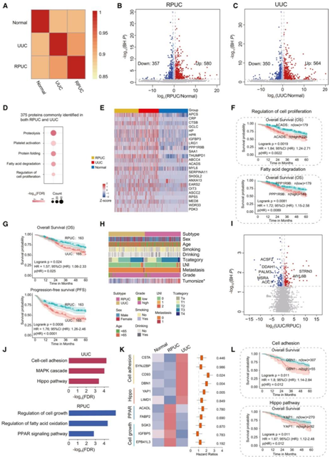 (A) RPUC、UUC 和正常样本之间血浆蛋白的 Spearman 相关性。(B) 火山图显示 RPUC 和正常血浆样本之间的蛋白质丰度差异。(C) 火山图显示 UUC 和正常血浆样本之间的蛋白质丰度差异。(D) 肾盂和输尿管样本中常见蛋白质的通路分析。(E) 热图显示正常样品和 UTUC 样品之间的蛋白质丰度差异。(F) UTUC 发现队列中 ACADS(上)或 PPP1R9B(下)蛋白丰度水平高或低的 UTUC 患者的总生存 (OS) 分析。(G) RPUC 与 UUC 患者的 OS 和无进展生存 (PFS) 分析。(H) RPUC 与 UUC 在临床信息方面的关联。(I) 显示 RPUC 和 UUC 之间蛋白质丰度的火山图。(J) RPUC(蓝色)和 UUC(红色)的通路分析。(K)(左)热图显示正常、RPUC 和 UUC 之间的蛋白质丰度。(右)每种蛋白质的风险比。(L) UTUC 发现队列中 DBN1(上)或 YAP1(下)蛋白丰度水平高或低的 UTUC 患者的 OS 分析。