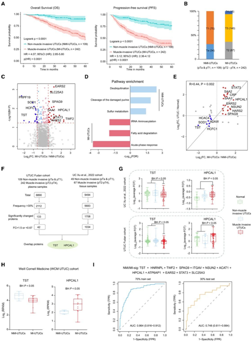 (A) NMI-UTUC 与 MI-UTUC 的 OS 和 PFS 的 Kaplan-Meier 曲线。(B) NMI-UTUC 和 MI-UTUC 中 T 类别的条形图。(D) NMI-UTUC 和 MI-UTUC 中 DEP 的丰富集通路。(E) UTUC 和正常血浆样本中 NMI-UTUC 和 MI-UTUC 比较的 DEP 差异倍数。(F) 筛选诊断血浆特征蛋白的策略。(G) 组织(顶部)和血浆(底部)队列中正常、NMI-UTUC 和 MI-UTUC 中 TST 和 HPCAL1 的蛋白质丰度。(H) WCM UTUC 队列中 NMI-UTUC 和 MI-UTUC 组织中 TST 和 HPCAL1 的 RNA 表达水平。(I) 分类器模型在 70% 训练集和 30% 测试集中预测 NMI-UTUC 和 MI-UTUC 的 ROC 曲线。