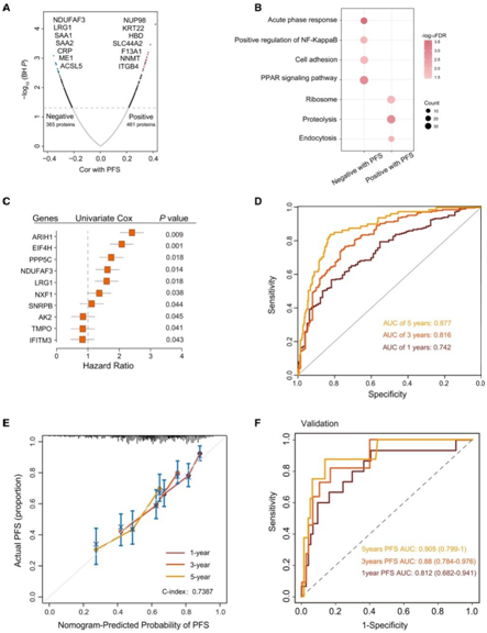 (A) 与 PFS 相关的蛋白质火山图。(B) 蛋白质富集的通路与 PFS 显著正相关或负相关。(C) PFS 单变量 Cox 风险模型的森林图。(D) 在 UTUC 发现队列中,1 年、3 年和 5 年时的 AUC 分别为 0.742、0.816 和 0.877。(E) 发现 UTUC 队列中预测和观察到的 1 年、3 年和 5 年 PFS 之间列线图的校准曲线。(F) 在使用 PRM 检测的验证队列中,1 年、3 年和 5 年时的 AUC 分别为 0.812、0.88 和 0.905。