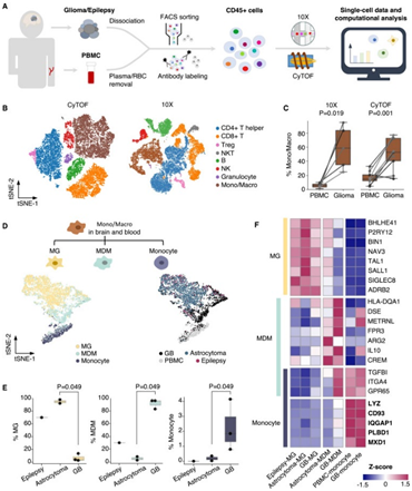 (A) 使用 10X 和 CyTOF 生成和分析免疫细胞景观的工作流程。(B) CyTOF 和 10X 鉴定的免疫细胞类型。((C) 通过 10X 和 CyTOF 分析的神经胶质瘤和 PBMC 中 Mono/Macro 的分数比较。(D) Mono/Macro 的子类型(左)和原始样本(右)10X 分析。(E)箱线图比较癫痫和神经胶质瘤患者中MG,MDM和单核细胞的分数。(F) 热图说明 MG、MDM 和单核细胞特异性标记物的表达。
