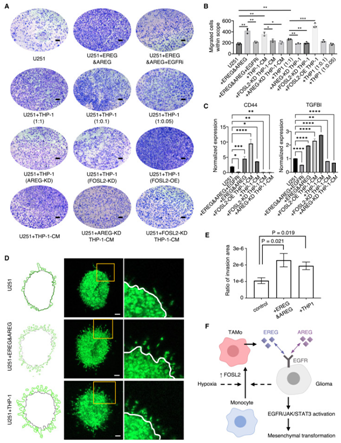(A) GB U251 细胞在不同处理条件下跨孔侵袭测定中的代表性图像。(B) 跨孔侵袭测定中 U251 侵袭性的量化。(C) 使用 RT-PCR 测定在不同处理条件下对 U251 细胞中的间充质标记物(包括 CD44 和 TGFBI)进行定量。(D) 在有和没有 AREG 和 EREG 处理的情况下包埋到细胞外基质中 24 小时后 GB U251 细胞球体侵袭的代表性图像。(E) 球体 GB 细胞侵袭的定量。(F) 提出的神经胶质瘤和/或缺氧介导的单核细胞重编程为 TAMo 的模型,该模型通过 FOSL2-EREG/AREG-EGFR 信号轴发挥作用,促进神经胶质瘤细胞的间质转化。