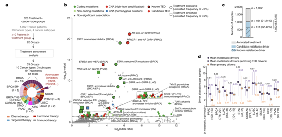 总的来说,有注释治疗信息的转移性疾病患者中有53%患有TED,其中有已知耐药性驱动因素注释的患者占32%,有候选耐药性驱动因素的患者占21%(图4c)。在报道过TED的8种癌症类型中,每个转移样本的TED中,前列腺癌和乳腺癌显示出最大的TED患病率 (图4d)。因此,在排除TED后,原发和转移性肿瘤在每个样本的驱动数上的原始差异减少了36%。这表明一个重要比例的转移富集驱动可能与抗肿瘤治疗耐药性相关。