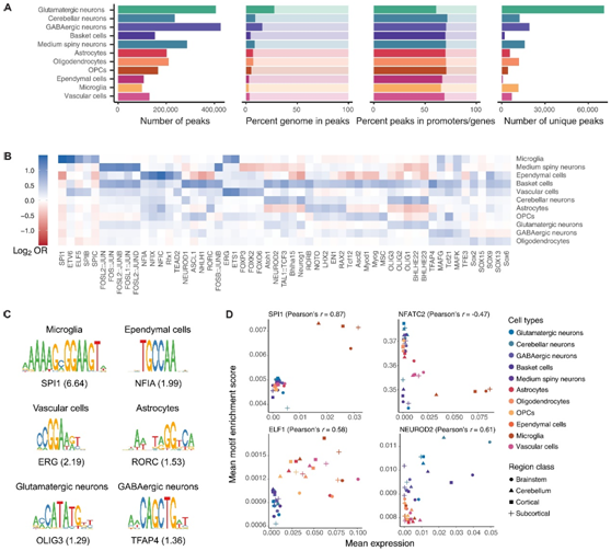 为了补充转录组数据集和识别大脑细胞中的关键调控基因组区域,他们应用了三水平单细胞组合索引ATAC-seq (sci-ATAC-seq3)来分析单细胞转座酶可及染色质测序(snATAC-seq)结果和表观基因组数据。