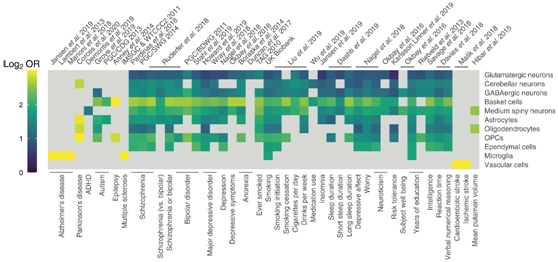 热图显示了所测试疾病、综合征和表型的细胞类 snATAC-seq 峰中疾病的遗传性富集。