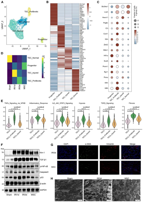 (A)假手术、IRI-AKI和MSC处理肾脏的TEC亚聚类。(B) TEC亚群中前15个基因的表达。(C) TEC亚群中代表性标记基因的表达。(D)各处理组细胞的相对百分比分布和富集情况。(E)小提琴图显示TEC亚聚类的通路富集。(F) Western blotting显示IRI-AKI和MSC处理的肾脏中KIM-1、TGF-β1、pi-NF-κB、caspase-3和p53蛋白的水平。(G)肾切片的多重免疫染色显示IRI-AKI (d3)和MSC处理的肾脏中纤维化标志物α-SMA(绿色)和vimentin(红色)的表达。(H)具有代表性的电镜图像显示假手术-、IRI-AKI (d3)-和MSC处理肾脏的线粒体形态变化。
