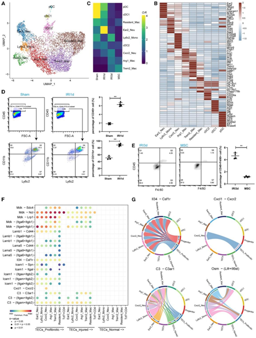 (A)来自假手术、IRI-AKI和MSC处理肾脏的骨髓细胞亚聚类。(B)前8个DEG在9个髓细胞亚群中的表达。(C)假手术组、IRI-AKI处理组和MSC处理组中每种髓细胞类型的相对贡献。(D)流式细胞术分析假手术组、IRI-AKI处理组Ly6c2+CD11b+单核细胞频率。(E)流式细胞术分析IRI-3 d和MSC治处理组CD11b+F/480+巨噬细胞频率。(F)热图显示骨髓细胞和TEC(配体-受体相互作用对)之间的细胞间相互作用。(G) Circos图显示髓细胞-TEC免疫相互作用网络。