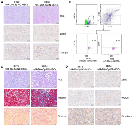 (A) PAS染色和免疫组织化学染色(ZEB2、TGF-b1)对IRI-3d肾组织+/- miR-26a-5p抑制剂处理。(B)流式细胞术图显示IRI-3 d肾组织+/- miR-26a-5p抑制剂处理中Th17细胞的比例。(C) PAS染色和Masson染色。(D)免疫组织化学染色代表性图像。