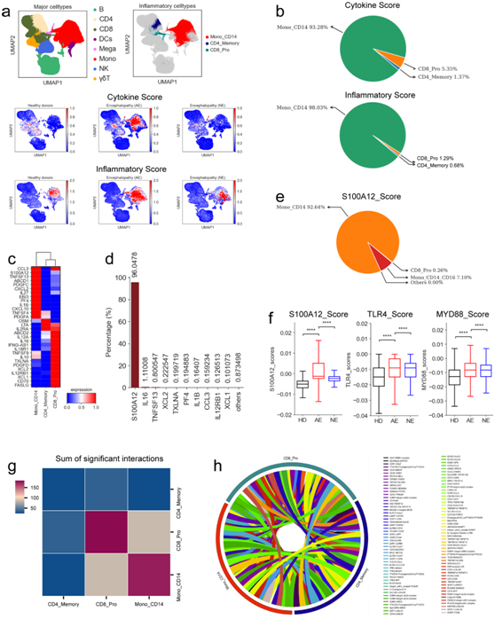 (a) PBMC 的 UMAP 可视化。 (b) 饼图描述了每种炎症细胞亚型对细胞因子和炎症评分的相对贡献。(c) 热图描绘了所识别的每种高炎症细胞亚型内细胞因子的表达。 (d) 条形图描绘了患有急性坏死性脑病的 COVID-19 患者中前 10 种细胞因子的相对贡献。 (e) 饼图描绘了每种细胞亚型对S100A12分数的相对贡献。(f) 箱线图描绘了不同组之间的 S100A12、TLR4 和 MYD88 基因表达评分。 (g) 3 种高炎症细胞亚型之间显著相互作用总和的热图。 (h) Circos 图描绘了 3 种高炎症细胞亚型之间的配体-受体对相互作用。
