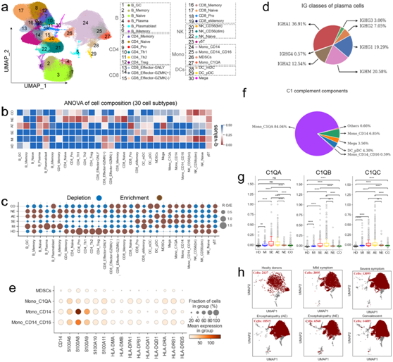 (a) UMAP投影显示从22个样本中鉴定出的30个细胞亚型。 (b) 热图显示了疾病类型之间细胞亚型组成差异的方差分析p值。(c)点图描绘使用 R O/E计算的 30 种细胞亚型疾病偏好。(d)来自 AE 的浆细胞重链类别。(e) 点图显示单核细胞亚型中所选单核细胞标记基因的表达。(f)饼图描绘了每种细胞亚型对 C1 补体成分的相对贡献。 (g) 箱线图显示不同组之间 Mono_C1QA 细胞中 C1QA、C1QB 和 C1QC 的表达。(h) 来自不同组的 Mono_CD14 细胞的 UMAP 投影密度图。