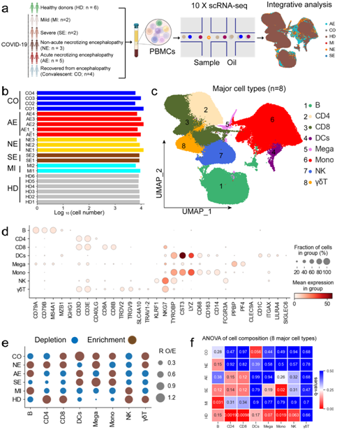 为了阐明 COVID-19 相关脑病的免疫特征,研究者团队收集 17 名儿童患者的 22 份 PBMC 样本进行了 scRNA-seq,以研究 COVID-19 脑病患者的免疫学和致病机制。这些样本包括7例住院脑病患者[4例急性坏死性脑病(AE)、3例非急性坏死性脑病(NE)]、2例重度症状但无脑病(SE)的患者,2例轻度或中度症状(MI)的患者,以及6例健康供体(HD)(图1a)。根据疾病类型和严重程度,将 22 个样本分为 6 组:AE、NE、MI、SE、CO(恢复期,其中1例与AE病例配对,3例与NE病例配对)和HD(图1a-b)。聚类分析和UMAP可视化鉴定出了8种主要细胞类型和30种细胞亚型(图1c-d),成功地定义了外周血中的细胞群/亚群组成。在UMAP投影上可以看到明显的差异(图1a)。主要细胞类型的疾病偏好用RO/E表示(图1e)。值得注意的是,在COVID-19合并急性坏死性脑病组中,大多数淋巴细胞群(包括CD8+ T、CD4+ T、NK、γδT细胞)显著减少(图1e),提示淋巴细胞减少可能是COVID-19相关急性坏死性脑病的一个突出特征。相反,急性坏死性脑病样本中的大多数髓样细胞(如单核细胞)发生富集(图1e)。用方差分析(ANOVA)分析时,淋巴细胞减少、髓样细胞增加和急性坏死性脑病之间存在相关性(图1f)。这些结果(淋巴细胞减少和髓样细胞升高)也见于表现严重疾病的COVID-19患者(图1e)。此外,他们发现COVID-19非急性坏死性脑病患者的外周免疫细胞组成变化与轻/中度症状患者相似(图1e)。
