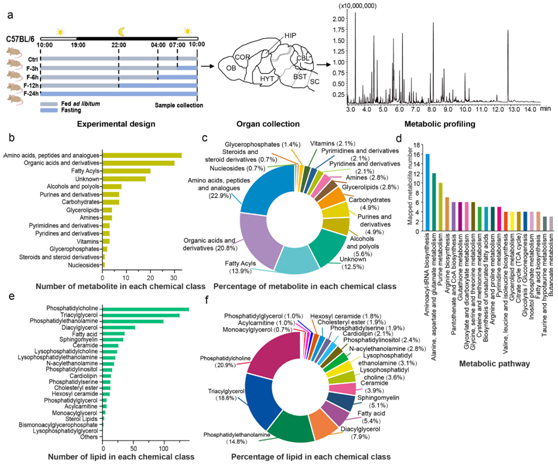 为了分析不同区域的大脑代谢组图谱并研究喂养方案对整体代谢重塑的影响,研究者团队对对不同禁食时间(3、6、12和24小时)或自由喂养的C57BL/6雌性小鼠的的七个大脑区域进行了基于气相色谱-质谱 (GC-MS) 的代谢组学和基于 LC-MS 的脂质组学分析(图1a)。这七个解剖学定义的区域包括嗅球(OB)、额叶皮质(COR)、下丘脑(HYT)、海马(HIP)、小脑(CBL)、脑干(BST)和脊髓(SC)。