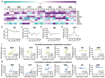 (a) 七个脑区 STF 差异表达氨基酸神经递质的热图。 (b) SC 中 STF 后 NAA/Asp 比率的变化。 (c-d) OB 中 STF 后 NAAG/NAA 和 NAAG/Glu 比率的变化。 (e) HYT 中 STF 后 NAAG/Glu 比率的变化。 (f) I期代谢产物的相关性。 (g) II期代谢产物的相关性。