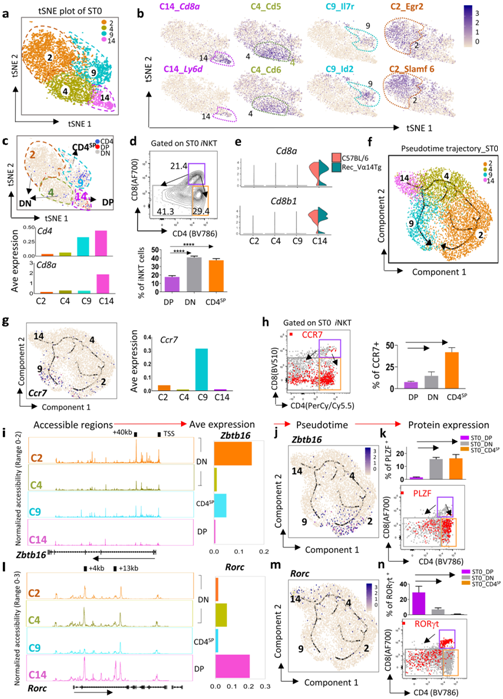 接下来,他们评估了ST0 iNKTp中Zbtb16 (编码 PLZF)的表达模式和染色质可及性,发现Zbtb16的+40kb和TSS在DP iNKTp (C14)中不可及,但在CD4SP (C9)和DN (C2和C4) iNKTp中可及,C2比C4开放程度高得多,与Zbtb16的表达模式非常相似(图3i-j)。伪时间轨迹和流式细胞术进一步表明Zbtb16在DN和CD4SP iNKTp中均富集(图3j-k)。