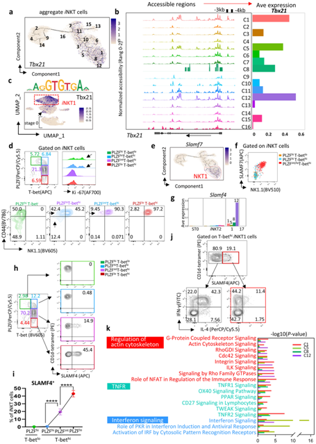 (a) 特征图描绘了iNKT 细胞发育中Tbx21的单细胞基因表达轨迹。 (b) 对于iNKT细胞聚类,Tbx21的scATAC-seq聚合(左)。条形图表示iNKT细胞聚类中Tbx21平均值(Ave)的表达(右)。 (c) 对于iNKT细胞聚类,Tbx21的scATAC-seq聚合(左)。条形图表示iNKT细胞聚类中Tbx21平均值(Ave)的表达(右)。(d) iNKT的门控代表性流程图。(e) iNKT细胞发育过程中Slamf7单细胞基因表达轨迹。(f) iNKT细胞中SLAMF7与NK1.1表达的代表性流图。(g) 条形图表示Slamf4 Ave在iNKT细胞聚类中的表达。(h) SLAMF4在iNKT2 (PLZFhiT-bet−)和不同iNKT1 (T-bethi)细胞中的代表性表达流图。(i) 点图表示平均SLAMF4±SD。(j) SLAMF4−(左)和 SLAMF4+(右)iNKT1 细胞在 PMA/Ionomycin刺激 4 小时后IL-4 与 IFN-γ 产生的代表性流程图。(k) 聚类C1, C5, C8和C12中的DEG。