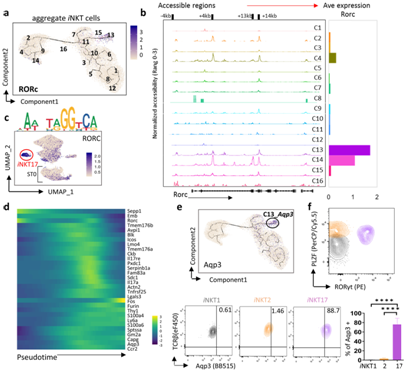 (a) iNKT 细胞发育中Rorc的单细胞基因表达轨迹的特征图。(b) iNKT细胞聚类的scATAC-seq(左)。柱状图表示iNKT细胞聚类中Rorc平均值(Ave)的表达(右)。(c) 由RORC-结合基序的活性着色的UMAP投影。(d) 显示scRNA-seq数据聚类13中前30个基因的伪时间排序的热图。(e) 表征iNKT细胞发育过程中Aqp3单细胞基因表达轨迹的特征图。(f) Aqp3表达的代表性流程图。