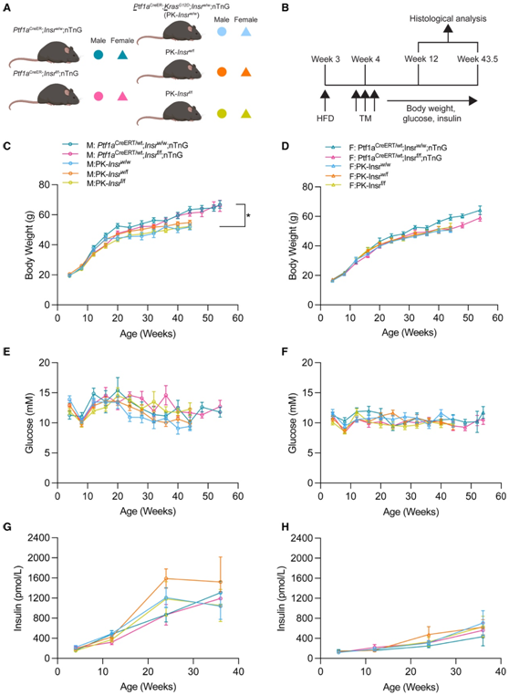 (A) 示意图描述了只在测试胰岛素受体信号传导对 HFD 加速 PDAC 启动的作用的小鼠模型。(B) 三周大的小鼠断奶并在研究期间提供高脂肪饮食 (HFD)。(C–H) 雄性和雌性小鼠的体重、空腹血糖以及空腹胰岛素测量值。