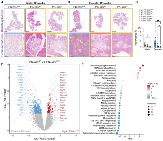 (A-B) 12 周龄雄性和雌性小鼠的胰腺切片。(C) 对每个基因型和雄性/雌性的 12 周龄胰腺中 PanIN 面积进行定量。(D) 与 PK- Insr w/w小鼠相比,PK-Insr f/f小鼠中显著上调或下调的基因的火山图。(E)基因集富集分析。