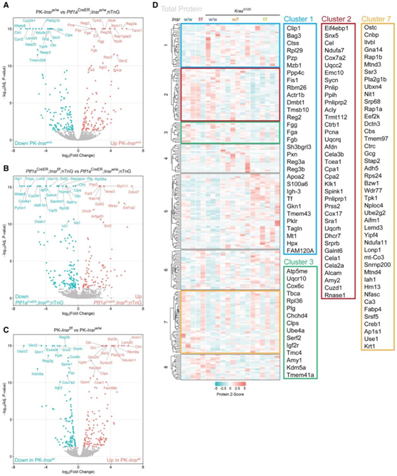 (A)与Ptf1a CreER相比,PK- Insr w/w小鼠中显著上调或下调的蛋白质的火山图。(B)显著上调或下调的蛋白质的火山图。(C) 火山图显示与 PK- Insr w/w小鼠相比,PK- Insr f/f小鼠中蛋白质显著上调或下调。(D) PK- Insr w/w和 PK- Insr f/f小鼠之间丰度差异的蛋白质,并将它们在所有基因型上的平均丰度用于 K 均值聚类。通过热图对聚类进行可视化。
